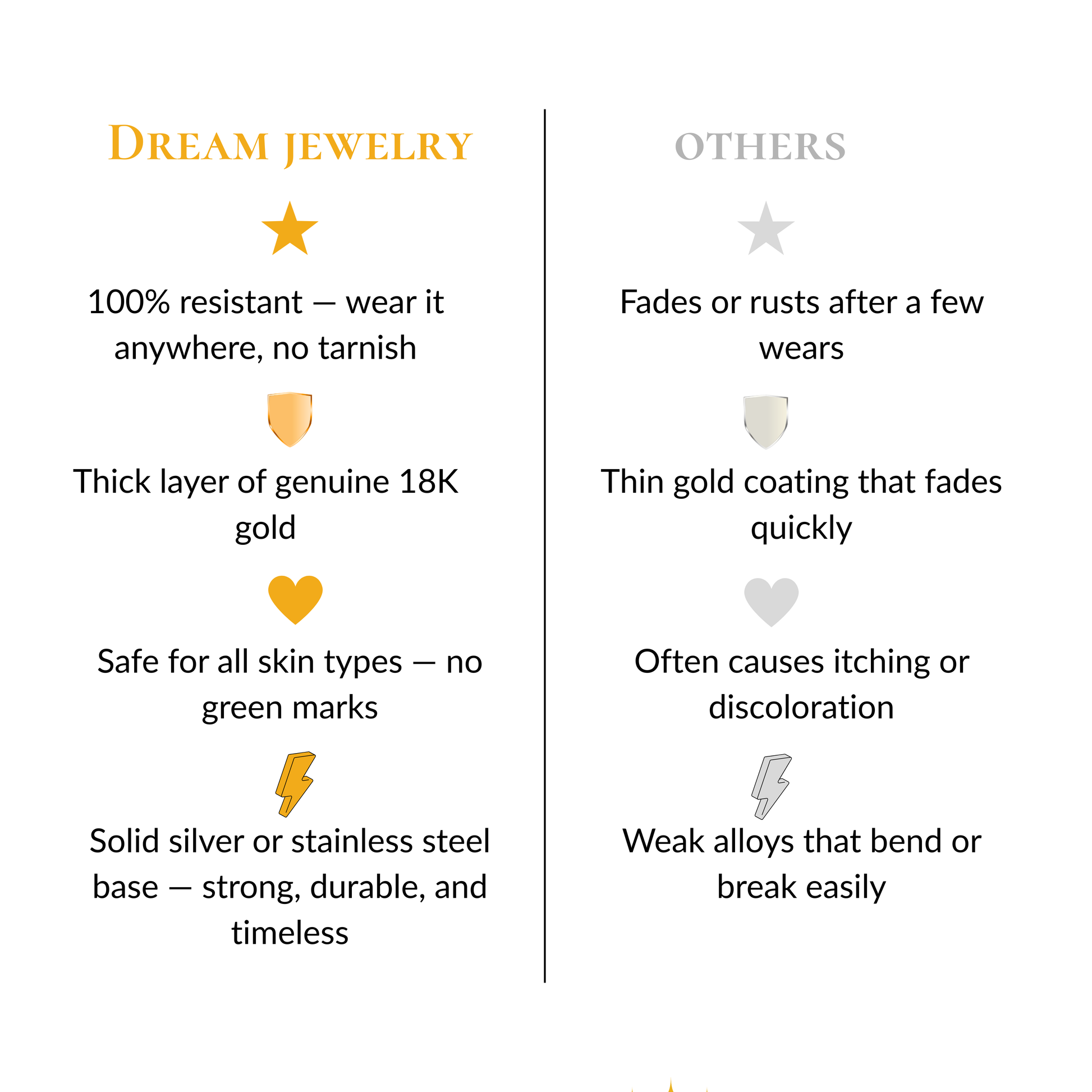 • No tarnishing — crafted from genuine, premium metals and coated in four layers of real 18K gold for a lasting shine.